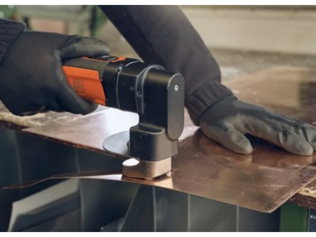 Skladné a křivkově průchodné nůžky na plech pro obrábění ušlechtilé oceli a plechy. Včetně náhradního rázové nebo stolového nože, permanentního popisovače, malířské pásky a skládacího metru.