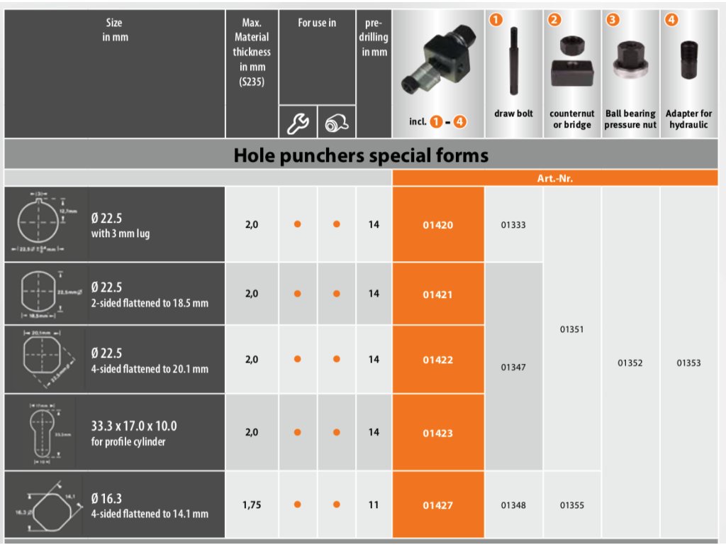pro ruční a hydraulické děrování oceli o pevnosti 370 N/mm2, tloušťka materiálu max. 2mm